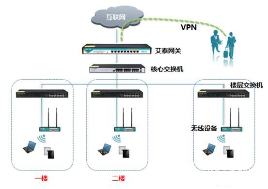 艾泰科技作為國內(nèi)知名路由器廠商之一,特別打造了適合該企業(yè)實際情況整體網(wǎng)絡(luò)解決方案。網(wǎng)關(guān)設(shè)備采用艾泰科技商睿系列高性能產(chǎn)品--4240G,為辦公用戶提供全面的上網(wǎng)行為管理、精細(xì)化限速、VPN功能;中心交換采用艾泰全千兆光口管理型交換機(jī)SG3124F,配合艾泰百兆基本型交換機(jī)SF1016作為樓層交換機(jī),同時各樓層采用著有“穿墻王”美稱的艾泰520W作無線覆蓋,輕松打造“高效、穩(wěn)定、安全、流暢”的整體網(wǎng)絡(luò)。