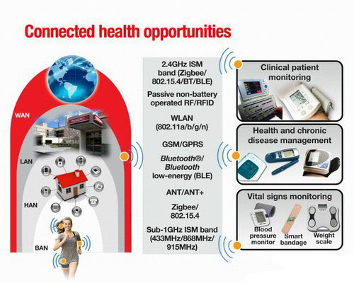 近年來,隨著藍(lán)牙低功耗(BLE)和ANT等低功耗無線技術(shù)在智能電話和一些單模外圍設(shè)備的廣泛采用,一個(gè)使廣大醫(yī)生和護(hù)理人員能夠無線連接醫(yī)療保健監(jiān)控系統(tǒng)的生態(tài)系統(tǒng)應(yīng)運(yùn)而生。盡管一些家庭保健設(shè)備可能是移動(dòng)式的(如活動(dòng)監(jiān)視器等),但有一些保健設(shè)備通常會(huì)固定安放在家里的某個(gè)地方(如體重秤等),可能無法連接無線網(wǎng)關(guān)。由于人們常常在家里四處走動(dòng),所以如手表或首飾等可穿戴式設(shè)備可以自動(dòng)將來自遠(yuǎn)處重量秤的緩沖數(shù)據(jù)傳輸?shù)郊抑辛硪惶幍木W(wǎng)關(guān)。