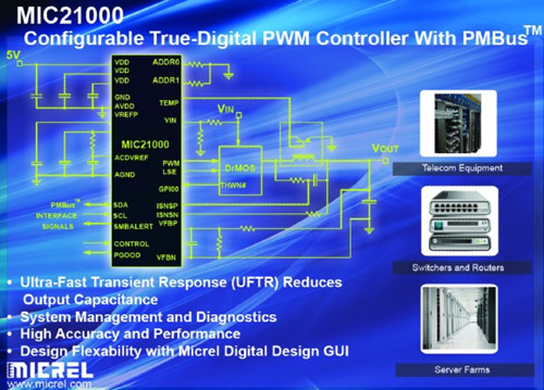 2013年12月19日,高性能線性和電源解決方案、局域網(wǎng)以及時(shí)鐘管理和通信解決方案領(lǐng)域的行業(yè)領(lǐng)導(dǎo)者麥瑞半導(dǎo)體公司(Micrel Inc.)為計(jì)算和電信應(yīng)用中使用的大電流、非隔離式直流-直流電源推出真正數(shù)字化的脈寬調(diào)制控制器MIC21000。MIC21000既支持麥瑞半導(dǎo)體擁有專利的IntelliMOS?解決方案,也兼容外部行業(yè)標(biāo)準(zhǔn)DrMOS,可靈活運(yùn)用于+12V或+5V降壓大電流負(fù)載端電源。MIC21000目前已經(jīng)開始批量供應(yīng),千片訂量的單價(jià)為3.75美元。