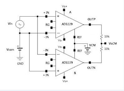 放大器A用作跟隨器,放大器B用作反相器,它們在OUTP和OUTN之間形成增益調(diào)節(jié)差分信號。不用增益電阻時(shí),系統(tǒng)默認(rèn)設(shè)置G = 2。若要求增益大于2,則可在RG兩端添加匹配增益設(shè)置電阻。