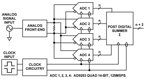 圖1. 四個并聯(lián)ADC求和得到更高SNR的基本框圖