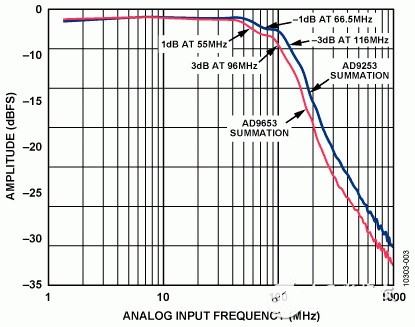 圖3. AD9253和AD9653四通道求和配置的頻率響應