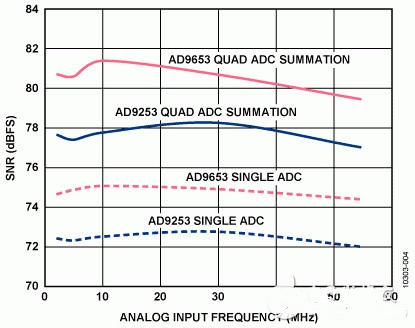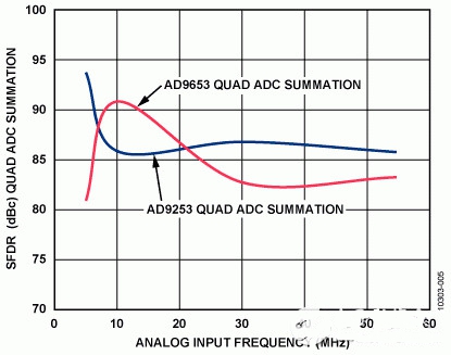 SFDR數(shù)據(jù)用于AD9253 和 AD9653, 的四通道求和配置,如圖5所示。