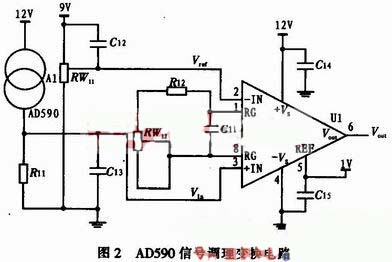 AD590是集成溫度傳感器,輸出為電流,相當(dāng)于恒流源,若要對(duì)此進(jìn)行放大需先轉(zhuǎn)換為電壓,可在其回路串入電阻,根據(jù)歐姆定律,電阻上電壓的大小可反映電流的大小,也就是溫度的高低。圖2是溫度傳感器AD590的信號(hào)調(diào)理變換電路。