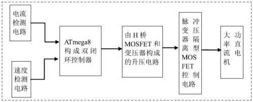 系統(tǒng)控制器主要采用的是ATmega8單片機為控制芯片。通過霍爾傳感器檢測電流,光電編碼器對速度進行檢測。在通過單片機產(chǎn)生PWM波來控制H橋的MOSFET,對MOSFET的驅(qū)動我們采用互補式的隔離脈沖變壓器驅(qū)動。將直流電逆變?yōu)榻涣麟娫谕ㄟ^變壓器將26V的直流升壓到180V的電壓。對電機的控制我們采用的是雙閉環(huán)調(diào)速系統(tǒng)。