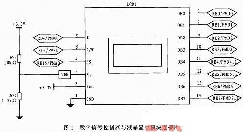 在16位的開發(fā)板上使用的液晶顯示模塊型號為TSB1G7000,它內(nèi)置有NT7603液晶顯示控制器,此液晶顯示模塊與dsPIC33F的內(nèi)部連接圖如圖1所示,可以看到,數(shù)字信號控制器的引腳RD4與液晶控制器的使能信號端E腳相連接,RD5與讀寫控制引腳R/W相連接,RB15與命令數(shù)據(jù)選擇端RS相連接,RE0-RE7分別與液晶顯示模塊的DB0-DB7相連接。單片機的13腳與30腳ADD接+5 V直流電源,31腳ASS接地。液晶顯示模塊的電源電路由16位開發(fā)板提供,這樣就完成了數(shù)字信號控制器與LCM構(gòu)成顯示系統(tǒng)的最小連接。
