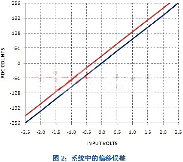 圖2顯示了范圍介于+2.5V之間的8位ADC示意圖。X軸表示輸入電壓,Y軸表示ADC計(jì)數(shù)。藍(lán)線為理想的ADC輸出。紅線則為實(shí)際的ADC輸出。請(qǐng)注意,實(shí)際輸出與理想狀態(tài)不同,這種差異就叫作偏移誤差。