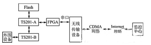 本系統(tǒng)處理數(shù)據(jù)多,計(jì)算量大,又有很強(qiáng)的實(shí)時(shí)性要求,選用ADI公司的高速處理芯片TigerSharc201s。Flash選用JS28F128,容量為256 Mb。系統(tǒng)設(shè)計(jì)采用兩片ADSP并行的模式。系統(tǒng)結(jié)構(gòu)如圖1所示,TS201A為主DSP,TS201B為從DSP。主DSP經(jīng)Flash采用EPROM加載方式,再通過(guò)Link口引導(dǎo)加載從DSP。本處理系統(tǒng)支持多種工作模式,監(jiān)控中心通過(guò)內(nèi)部協(xié)議遠(yuǎn)程管控處理系統(tǒng)。從DSP實(shí)現(xiàn)信號(hào)處理計(jì)算,把處理計(jì)算結(jié)果傳遞給主DSP;主DSP實(shí)現(xiàn)管控模塊,通過(guò)外圍芯片F(xiàn)PGA的串口協(xié)議發(fā)送給無(wú)線傳輸設(shè)備,通過(guò)CDMA模塊用無(wú)線網(wǎng)絡(luò)的形式,發(fā)送到監(jiān)控中心軟件。監(jiān)控中心通過(guò)協(xié)議對(duì)其可實(shí)現(xiàn)遠(yuǎn)程管理,包括數(shù)據(jù)庫(kù)文件更新、程序更新和狀態(tài)模式轉(zhuǎn)換。