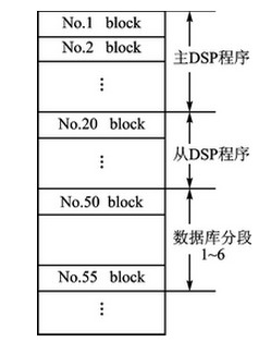 Flash內(nèi)部分為256個(gè)block,可以擦寫(xiě)任意位置的block段,沒(méi)有擦寫(xiě)的block數(shù)據(jù)不會(huì)丟失。根據(jù)這一特性,把兩片DSP軟件程序和分段的數(shù)據(jù)庫(kù)的燒寫(xiě)位置分開(kāi)。Flash空間地址分配如圖2所示。